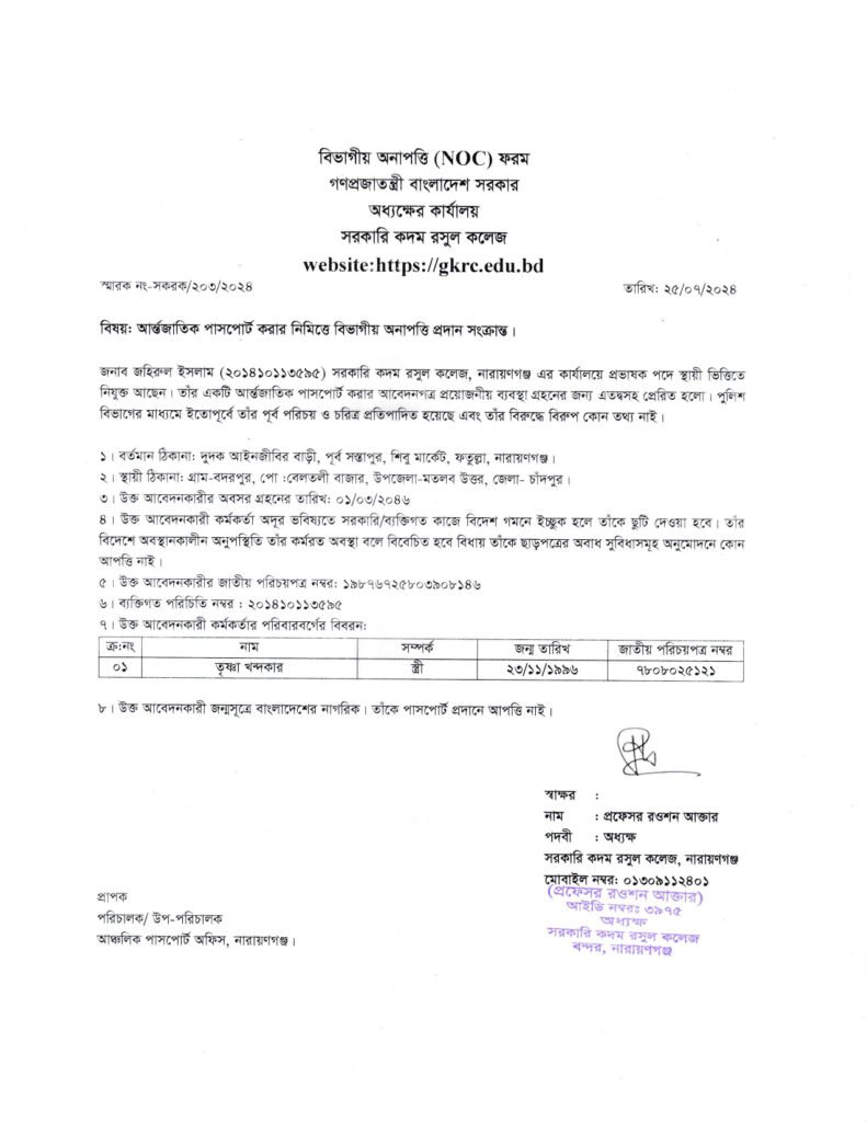 আর্ন্তজাতিক পাসপোর্ট করার জন্য হিসাববিজ্ঞান বিভাগের প্রভাষক জহিরুল ইসলাম কে অনাপত্তি (NOC) প্রদান