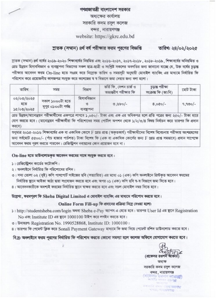 অনার্স ৪র্থ বর্ষের 2023 সালের চূড়ান্ত পরীক্ষার ফরম পূরণের বিজ্ঞপ্তি ঃ